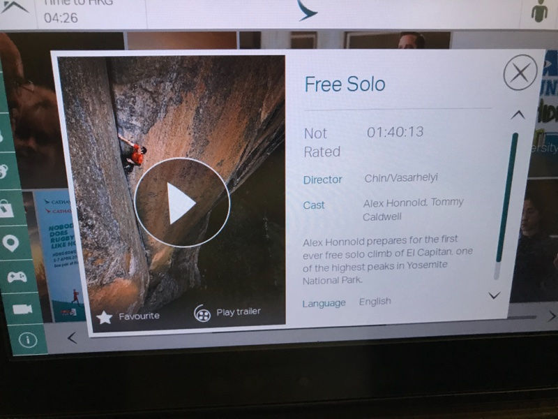 Tracey and Catherine saw me off at airport. Baggage checked customs done. On the plane an empty seat next to me and free solo on the play list. You know you have to!! But no popcorn. Oh well 2 out of 3 ain’t bad.