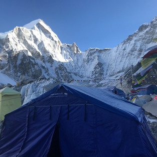 Location, Location, Location. Yesterday we arrived in base camp. Walking along the moraine that flanks the Khumbu glacier the strip of yellow and blue tents that make up EBC never seemed to get any closer. The scale of the peaks and valleys that make up this landscape distort my perception of distance and time. Along the way I keep tripping up due to poor footing because I can’t help but look towards the sky. Once we arrived at the outskirts of EBC it took another 15 min to arrive at our Himalayan Ascent camp site. I can’t lie it is fully catered and has all the mod cons. Particularly impressive as we are now living on the glacier directly opposite the Khumbu Ice Fall. Over the next few days, led by Lama Tenji, we will hold our Puja ceremony. Only after this will we make our first exploration of the ice fall towards camp 1 and the Western Cwm.
